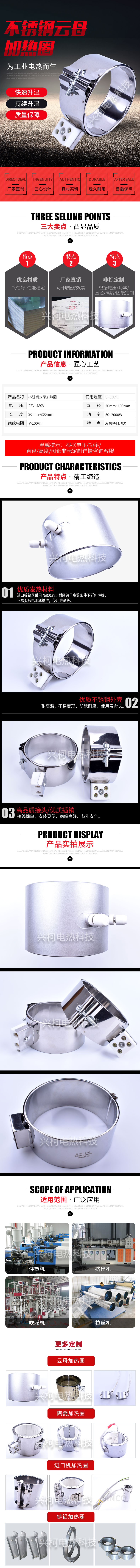云母電加熱圈以0.3~0.5mm不銹鋼板為外殼, 中間以高絕緣性耐高溫的云母板為芯, 均勻繞以各種標準規格的鎳鉻合金電阻絲作為發熱體, 經成型機加工成各式所需形狀。可根據用戶需求的接線方式, 電壓從110V、180V、220V、380V ,高功率負載每平方3.5W , 高工作溫度600-800℃之間。將外散熱面增加保溫裝置, 內散熱面燒結紅外線這樣可節約用電35%。不銹鋼云母加熱器有圈型和板狀等規格, 具有加工簡單, 工作可靠, 使用方便, 升溫迅速, 熱效率高, 耗電量小, 使用壽命長、制作不受型號和規格大小的限制等優點。廣泛應用于塑料機械、包裝印刷、石油化工、電子設備等行業。